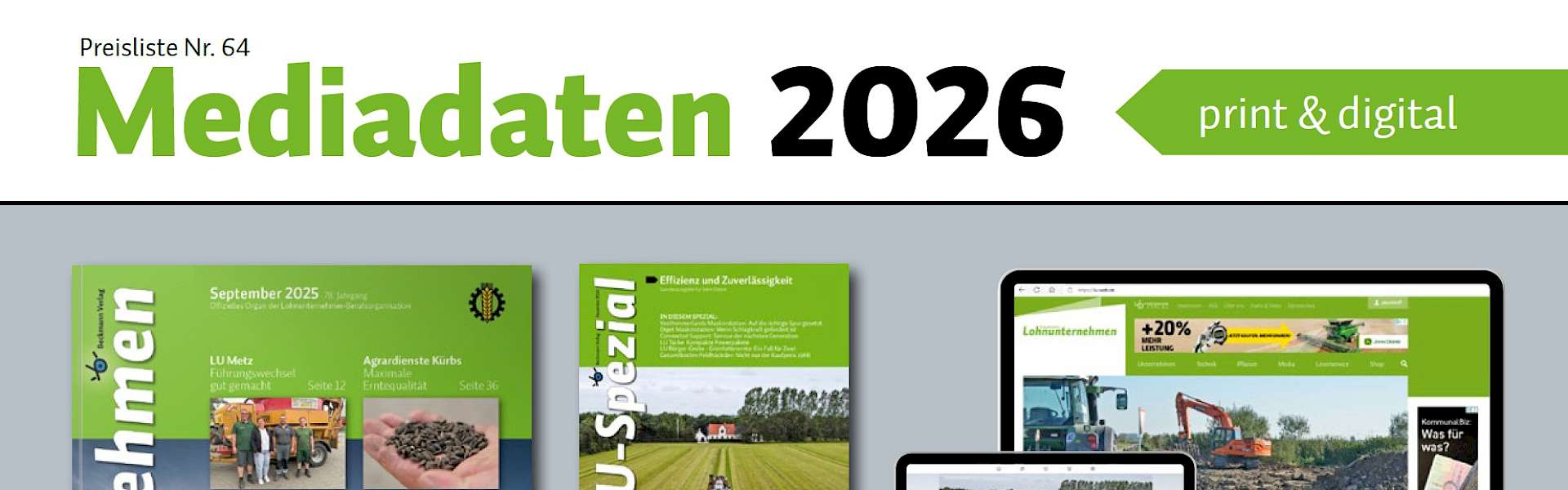 Mit geprüften Reichweiten, attraktiven Formaten und crossmedialen Lösungen bieten wir Ihnen die ideale Plattform, um Lohnunternehmer und Entscheider in der Branche zu erreichen.