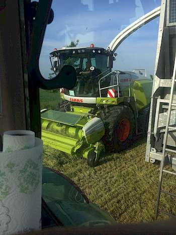 Ein paar Tage war dann auch die Häckselkette im Ackergras und Grünland im Einsatz, was eigentlich die stressigste Zeit des Monats war – es musste gemäht, geschwadet, gehäckselt und gewalzt werden, während eigentlich schon die Gärreste auf den Acker sollten, um zügig den Mais nach dem Ackergras zu säen.