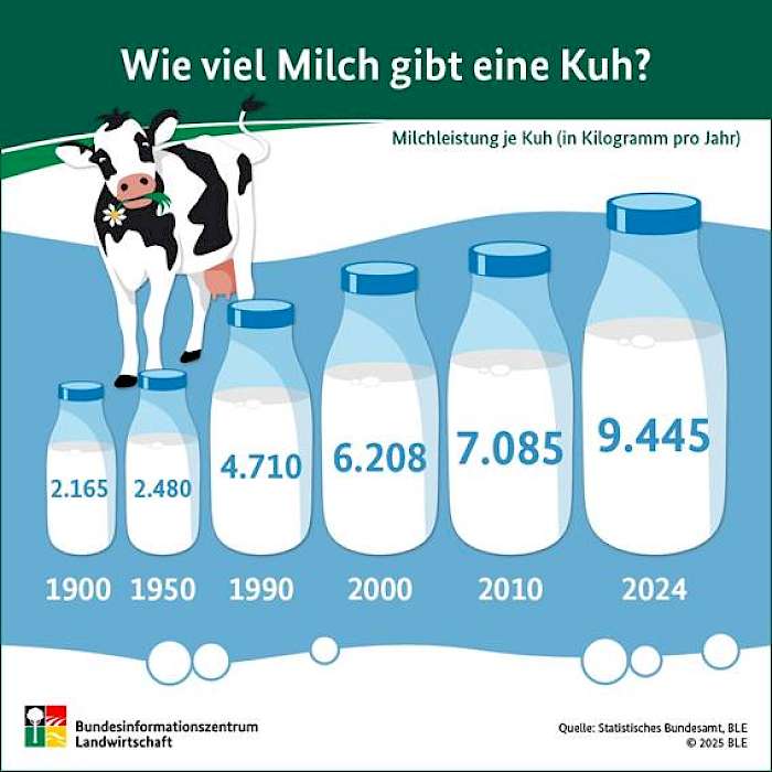 Im Durchschnitt 9.445 Kilogramm Milch gab eine Milchkuh 2024 in Deutschland. Dabei entspricht 1 Liter Milch 1,03 Kilogramm. Am Tag kommt eine heutige Milchkuh damit auf rund 30 Liter Milch.