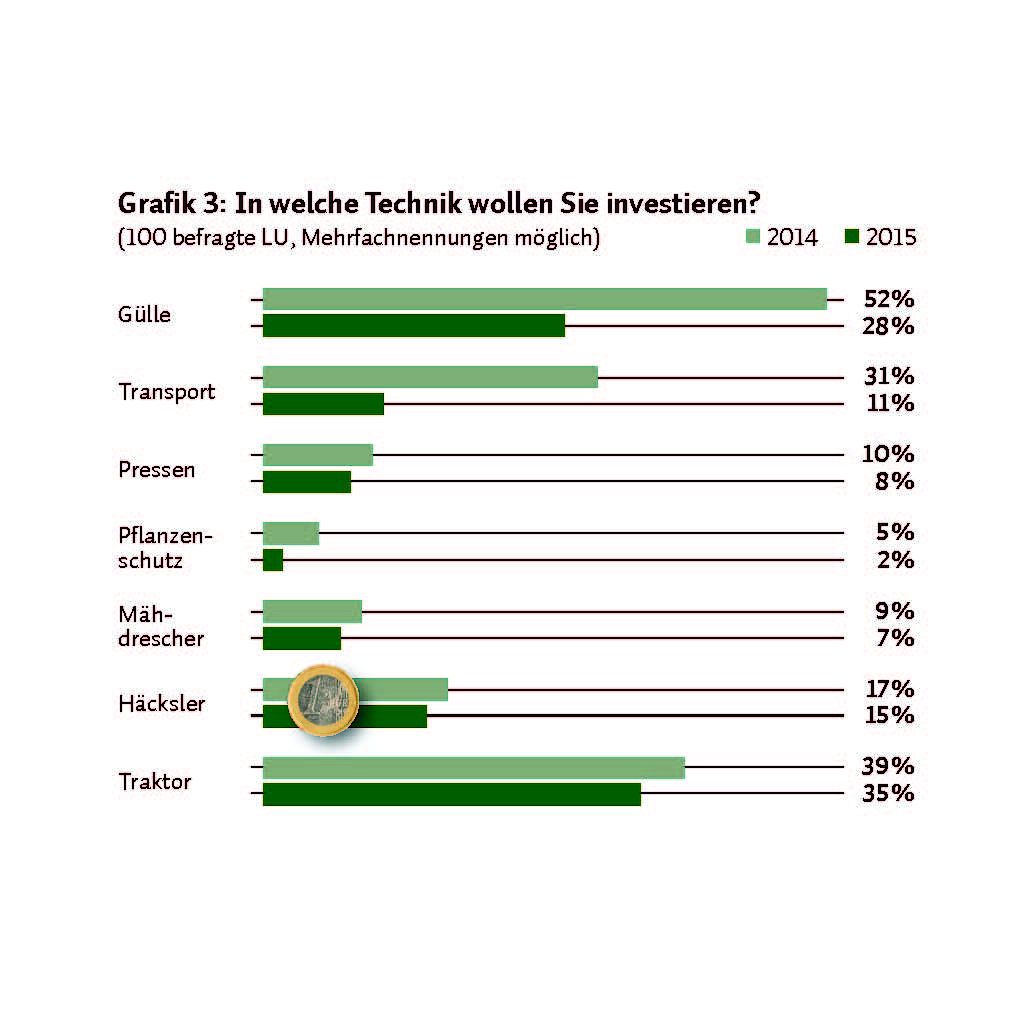 Doch wofür wird das Geld eigentlich ausgegeben? Die in Grafik 3 gebündelten Antworten auf diese Frage zeichnen ein erkennbar anderes Bild als bei unserer Umfrage 2014. In allen von uns abgefragten Techniksegmenten wird weniger eingekauft, wenngleich der Rückgang insgesamt eher moderat ausfällt. Wichtig bei der Beurteilung: dargestellt ist die Anzahl Lohnunternehmer, die in dem jeweiligen Segment investieren wollen, nicht die Zahl der beabsichtigten Maschinen!