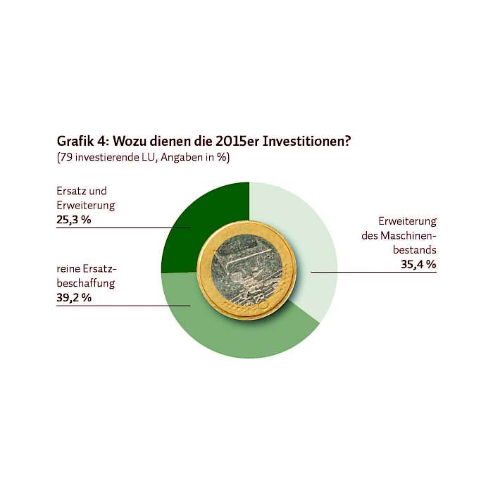 Neu war in diesem Jahr unsere Frage an die Lohnunternehmer, inwieweit die Investitionen der Ersatzbeschaffung oder der Erweiterung des Maschinenbestandes dienen (Grafik 4). Gut 39 % der investierenden Betriebe ersetzen tatsächlich vorhandene Technik. Für rund ein Viertel der Befragten ist beides relevant, wobei hiervon das Gros „50-50" antwortete. Aber immerhin gut ein Drittel der Lohnunternehmer investiert 2015 überwiegend bzw. ausschließlich, um den Maschinen- und Gerätebestand zu erweitern.