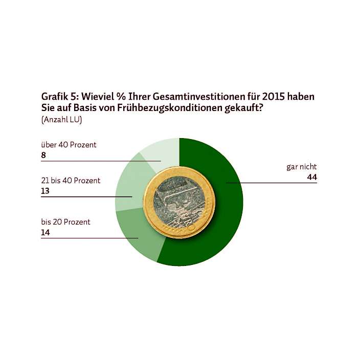 Wenig verwundern dürfte, dass wir bei dieser Umfrage in Sachen Geld noch ein wenig neugieriger waren. So interessierte uns auch, ob Frühbezugskonditionen für Lohnunternehmer interessant sind (Grafik 5). Ergebnis: Für 56 % spielt dies keine Rolle (Vorjahr 59 %). 18 % nutzen in diesem Jahr derartige Angebote zumindest für ein Fünftel ihrer Investitionen (2014: 18 %). 16 % der Unternehmer kaufen 2015 in diesem Kontext zwischen 21 und 40 ihrer Maschinen ein (2014: 9 %). Bei 10 % gilt dies 2015 sogar für über 40 ihrer Technikinvestitionssumme (2014: 14 %). Fazit: Der Mehrheit der Lohnunternehmer sind Frühbezugsangebote nach wie vor egal, aber der Anteil derer, die es zumindest teilweise nutzen, steigt.