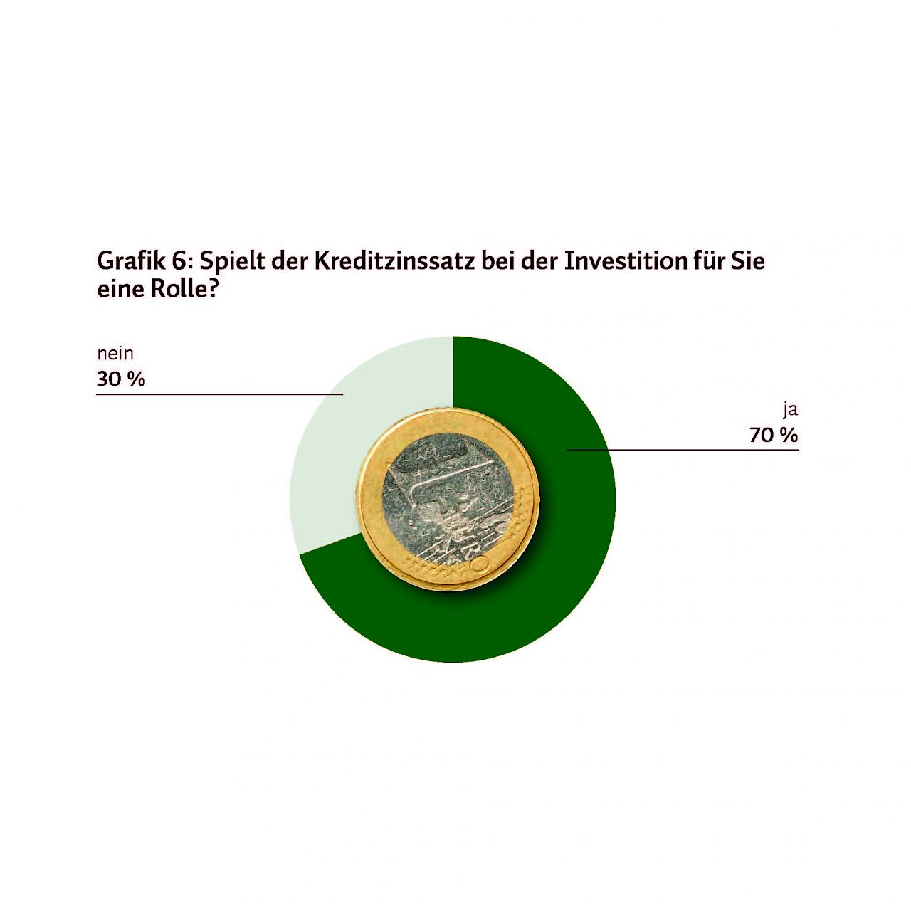 Spannend fanden wir auch die Frage, inwieweit der Zinssatz bei der Investitionsfreudigkeit eine Bedeutung hat (Grafik 6). Hierbei könnte man vermuten, dass die historisch niedrigen Kreditzinsen stimulieren. Und tatsächlich: Für 70 % der Lohnunternehmer ist der Zinssatz wichtig. Aber zwei Drittel gaben an, in den zurückliegenden vier Jahren deswegen nicht überdurchschnittlich viel investiert zu haben. Dies spricht dafür, dass bei derartigen Planungen mehr die betriebswirtschaftliche „Denke" überwiegt.