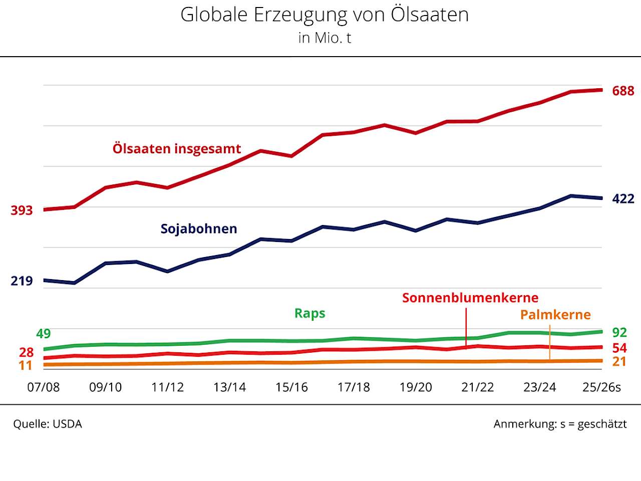 Bei der Schätzung der Menge an Ölsaaten ist darauf hinzuweisen, dass das USDA darin u. a. auch Erdnüsse (ca. 51,3 Mio. t), Baumwollsaat (ca. 41,5 Mio. t) und Kopra (5,9 Mio. t) berücksichtigt.