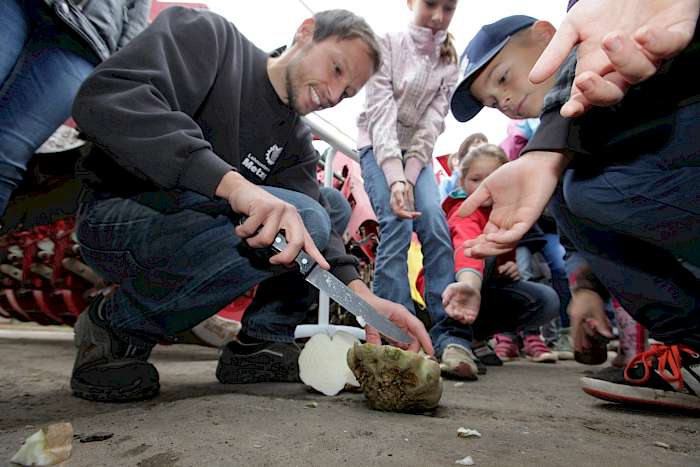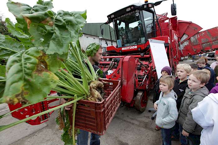 Zum Schluss durften die Schüler die geernteten Zuckerrüben auch probieren. Viele kannte die Früchte bislang nur aus sicherer Entfernung, doch den meisten Kindern mundete die Rübe, die sonst zu Zucker verarbeitet wird. Die nächste Raffinerie steht in der Börde in Klein Wanzleben. Michael Metzger freute sich über den Besuch der Kinder. "Man kann nicht früh genug anfangen, die Menschen in der Region für sein Unternehmen zu sensibilisieren. Das könnten unsere Azubis von übermorgen werden", sagt der Betriebswirt, der zusammen mit seinem Vater und seiner Schwester das Unternehmen leitet. Die Mädchen und Jungen fuhren nicht nur mit einem Lächeln, sondern auch einer Hausaufgabe nach Hause. Sie sollten ein Blatt mit einer Rübe ausmalen und die Bestandteile beschriften. Als Anhaltspunkt hatten sie auch eine echte Frucht im Gepäck.