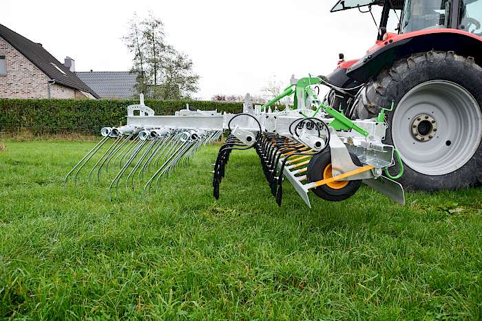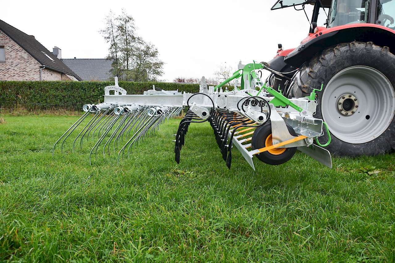 Die Wiesenschleppe soll außerdem die Überlebensmöglichkeiten von Parasiten während des Winters reduzieren. Zwei vibrierende Messerreihen führen eine aggressive, striegelnde Arbeit aus, um das Wachstum und die Produktivität der Weide zu verbessern. Die drei hinteren Reihen von gefederten Zinken sollen die Weide von Moos befreien.