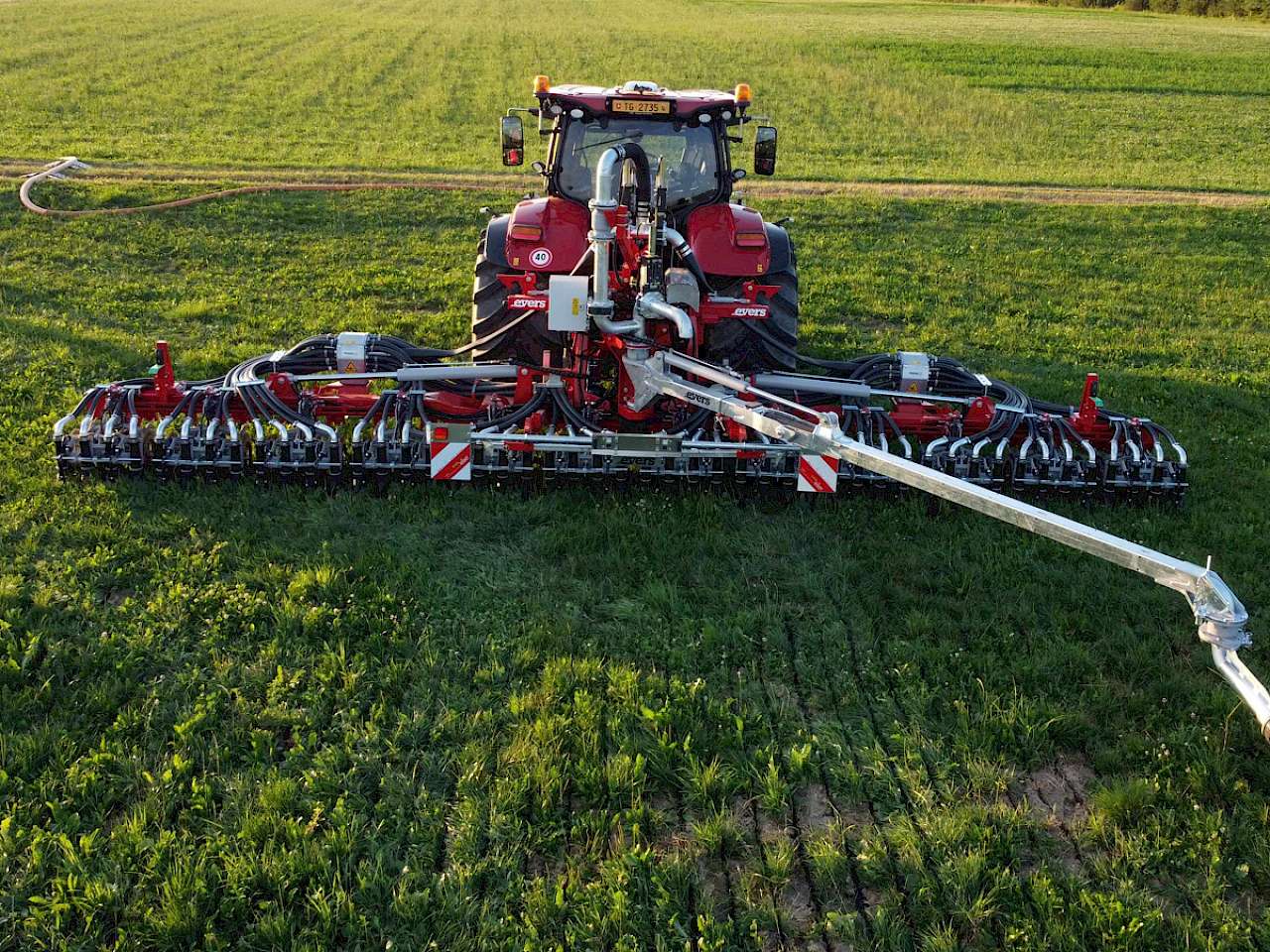 Ziel der Quadro Disc von Evers ist eine effiziente, bodenschonende Ausbringung mit hoher Schlagkraft und optimaler Befahrbarkeit auch auf weniger tragfähigen Böden. Der am Hauptrahmen montierte Verschlauchungsarm überträgt die Zugkraft direkt auf den Mittelrahmen, sichert eine saubere Zuglinie und verhindert negative Einflüsse auf die Arbeitsweise von Scheiben und Zinken, sodass die Arbeitsqualität konstant bleibt.