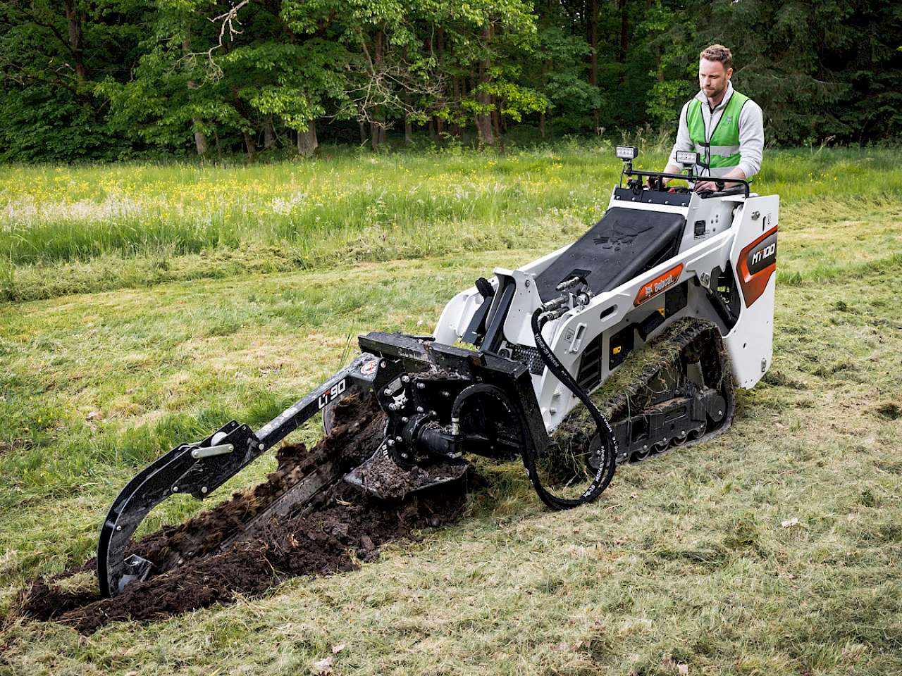 Fünf Erdbohrerantriebe (11H, 28H, 28LH, 33H, 55LH) von Bobcat decken Hydraulikleistungen von 30 bis 200 l/min ab und sind mit Minibaggern, Kompakt- und Raupenladern, Knickladern, Radladern sowie Teleskopen kompatibel. Die Antriebe lassen sich mit verschiedenen Bohrschnecken kombinieren und nutzen vorhandene Hammer-Kopfplatten. Da die komplette Einheit ins Bohrloch eintaucht, sind laut Hersteller mehr als 30 cm zusätzliche Bohrtiefe möglich. LH-Modelle verfügen über ein integriertes LED-Ausrichtungssystem für lotrechtes Bohren aus der Kabine. Ebenfalls neu sind fünf Grabenfräsen (LT90 bis LT150 HD) mit Grabtiefen von 450 bis 1.500 mm. Ein federbelasteter Grabenräumer formt den Graben in einem Arbeitsgang, Planetenantriebe übertragen hohes Drehmoment. Einstellbare Kufen mit vier Tiefenstufen und eine hydraulische Seitenverschiebung erweitern das Einsatzspektrum.