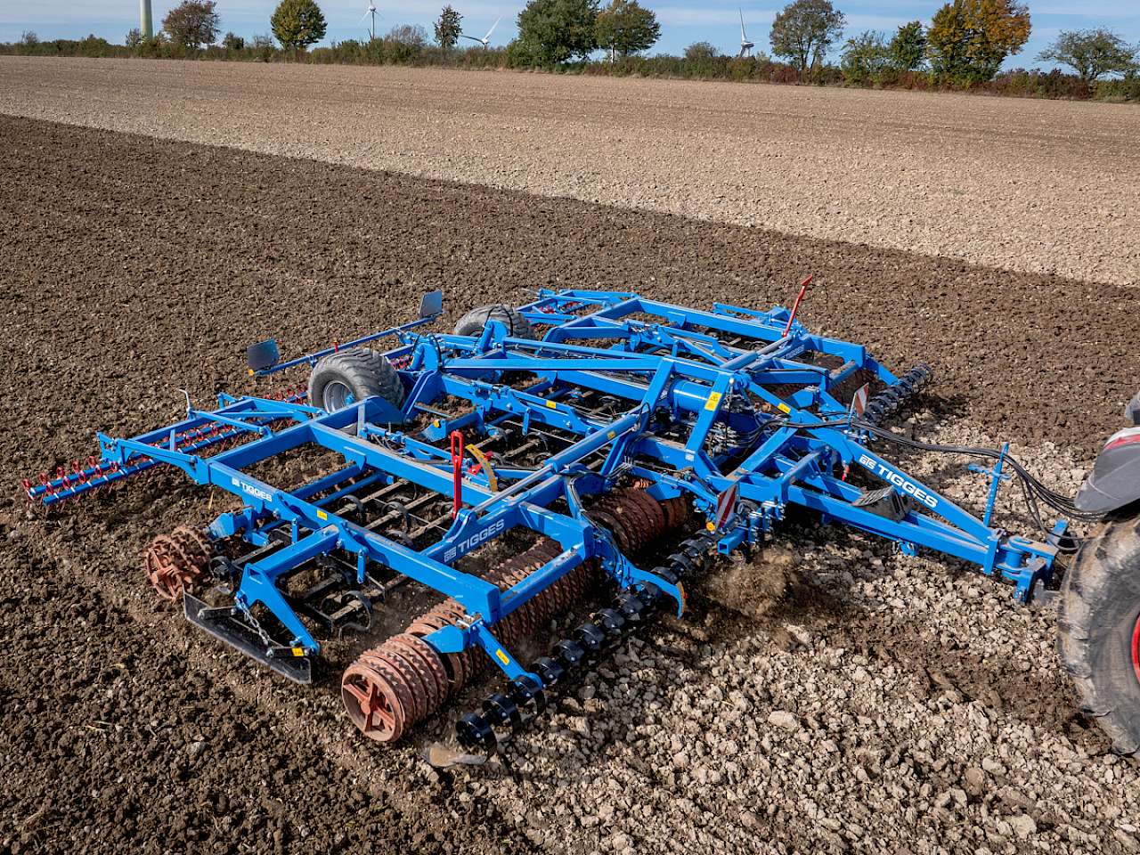 Die Saatbettkombinationen Kurant von Tigges soll mit verschiedenen Arbeitsbreiten im Bereich 5,3 m bis 8 m eine schlagkräftige Saatbettbereitung ermöglichen. Kurant ist nach dem Grundprinzip Einebnen - Rückverfestigen - Krümeln - Rückverfestigen aufgebaut und kann in den einzelnen Sektionen mit verschiedenen Vorwerkzeugen, Walzentypen und Zinkenvarianten bestückt werden. Das Zinkenfeld ist serienmäßig hydraulisch verstellbar und kann auf Wunsch mit Gänsefußscharen ausgestattet werden. Als abschließendes Werkzeug ist ein ein- oder zweireihiger Striegelbalken erhältlich. Die Maschine zeichnet sich laut Tigges durch Ihre Leichtzügigkeit und Ihre hohe Flächenleistung bei gleichzeitig niedrigem Verschleiß und geringem Kraftstoffeinsatz aus, vor allem im Vergleich zu zapfwellenangetriebenen Geräten. Die Anordnung der Walzen und Zinkensektionen sorgt für eine intensive Krümmelung und effektive Rückverfestigung.